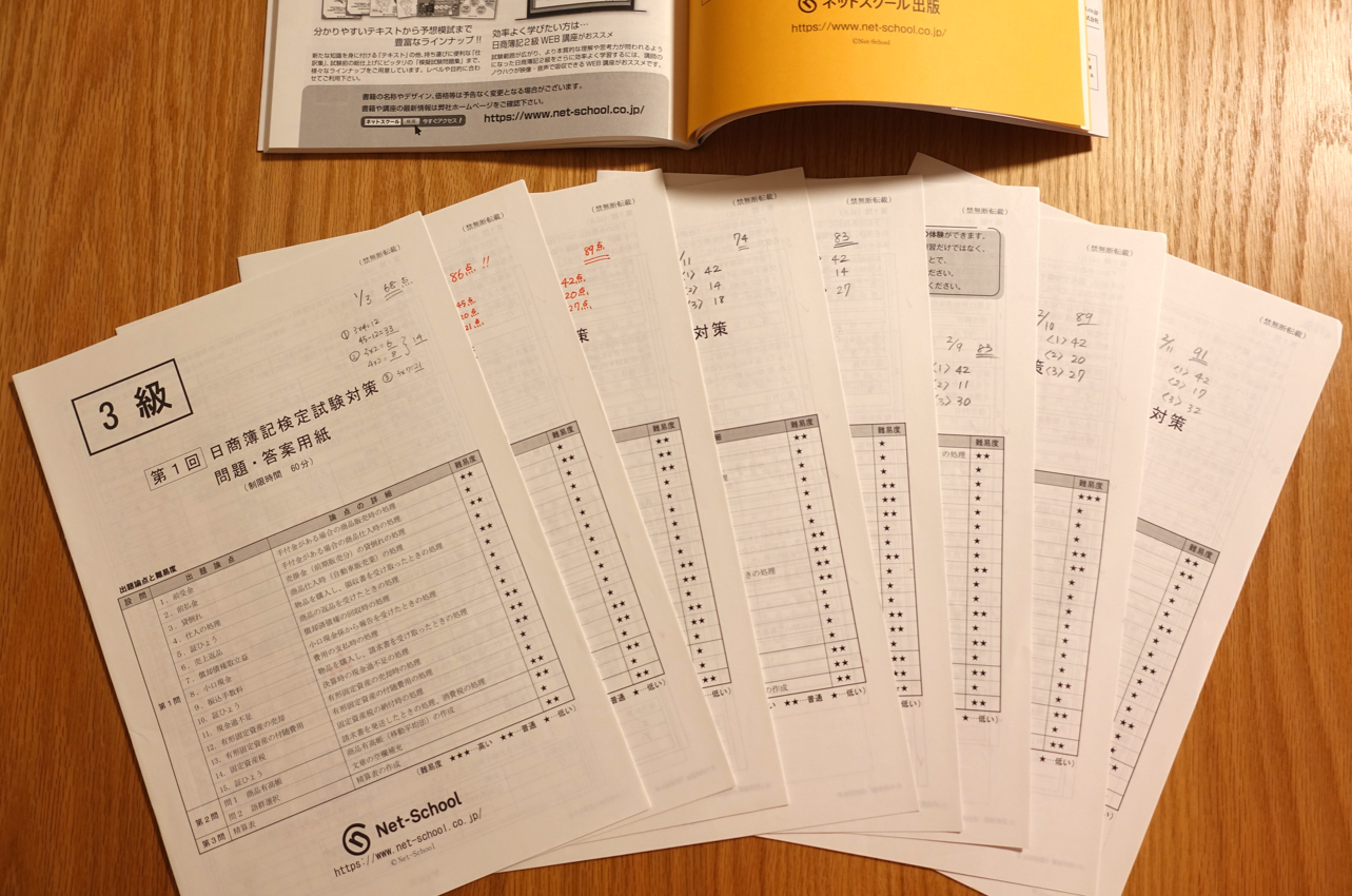 上で紹介したCPAのものを利用してもいいですし、このネットスクール出版の日商簿記検定模擬試験問題3級もおすすめです。※リンクは2025年度版ですが、そろそろ2026年度版が出るはず・・・