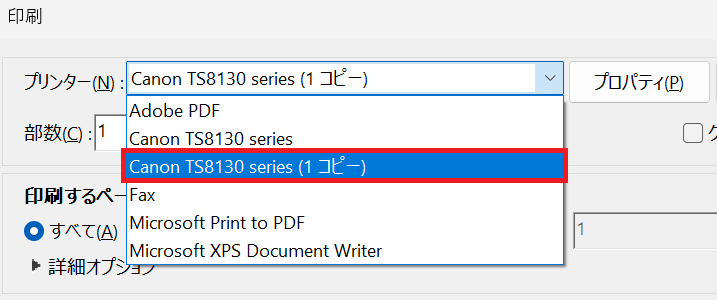 代わりに『Canon TS8130 series(1 コピー)』というのが生成されていて、そちらを選択すると印刷できました!