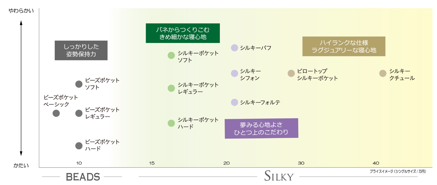 日本ベッドのマットレスは、『シルキー』シリーズと『ビーズ』シリーズの2つのシリーズに分けられます。